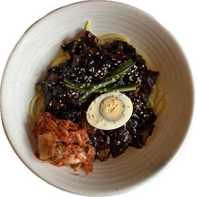 Makaron z pastą chunjang z czarnej fasoli podawany z warzywami oraz jajkiem.